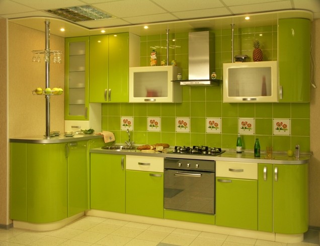 На салатовой кухне настолько нередко возникающие царапинки и потертости будут не так приметны.