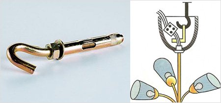 - Люстра весит до 3 кг и крепится на крюк. В таком случае нужен особый крюк-бабочка. Он состоит из пластмассовой обоймы особенной конструкции и винтообразного крючка. Под обойму бабочки сверлят в гипсокартоне отверстие, на один-два оборота ввинчивают крюк в обойму. Потом обойму вставляют до упора в отверстие и доворачивают крюк до отказа. Внутренняя часть бабочки разворачивается в лепестки, которые и фиксируют крюк.