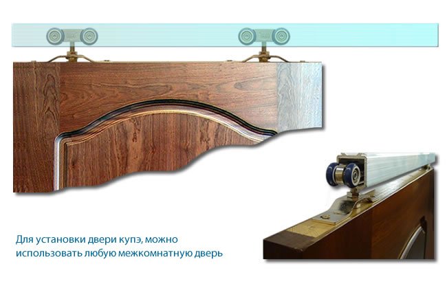 В случае если устанавливается дверь-перегородка для разделения места комнаты и направляющая закреплена от стенки до стенки, каретки заранее заводятся в направляющую, которая имеет особое окошко для этого. Закрепление дверного полотна в данном случае сводится к стыковке скоб-держателей на двери и анкера отходящего от каретки.